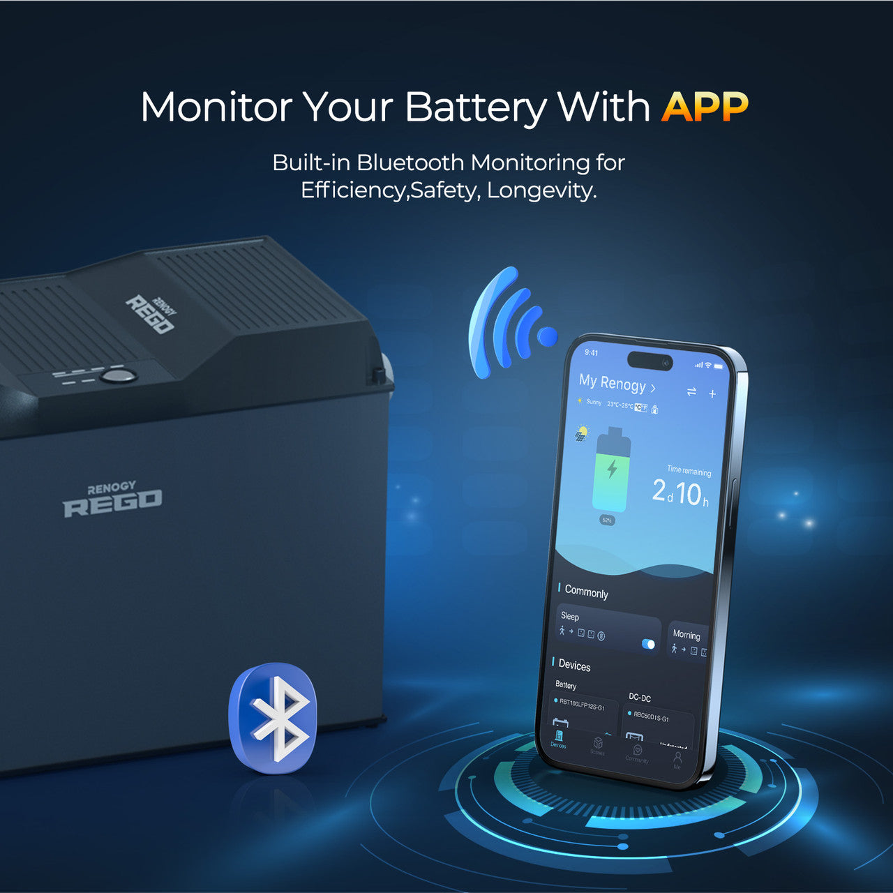 The Rego battery has built-in Bluetooth and also has CAN communication ports. It supports both Bluetooth communication and CAN (RV-C) communication.