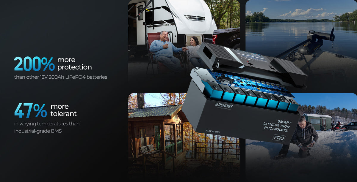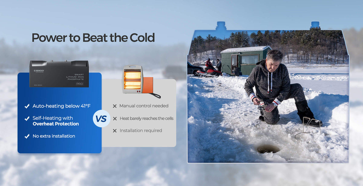 Per gli appassionati delle attività all’aperto invernali, come la pesca sul ghiaccio, una batteria LiFePO₄ autoriscaldante è indispensabile. La batteria Pro LiFePO₄ da 12V 200Ah può riscaldarsi automaticamente quando riceve una corrente di carica superiore a 6A, garantendo una ricarica sicura anche a temperature sotto lo zero. Fornisce energia costante per prolungare la durata di ecosondaggi e altre attrezzature essenziali. (Si consiglia il caricabatterie Renogy 12V 20A AC-DC LFP.)