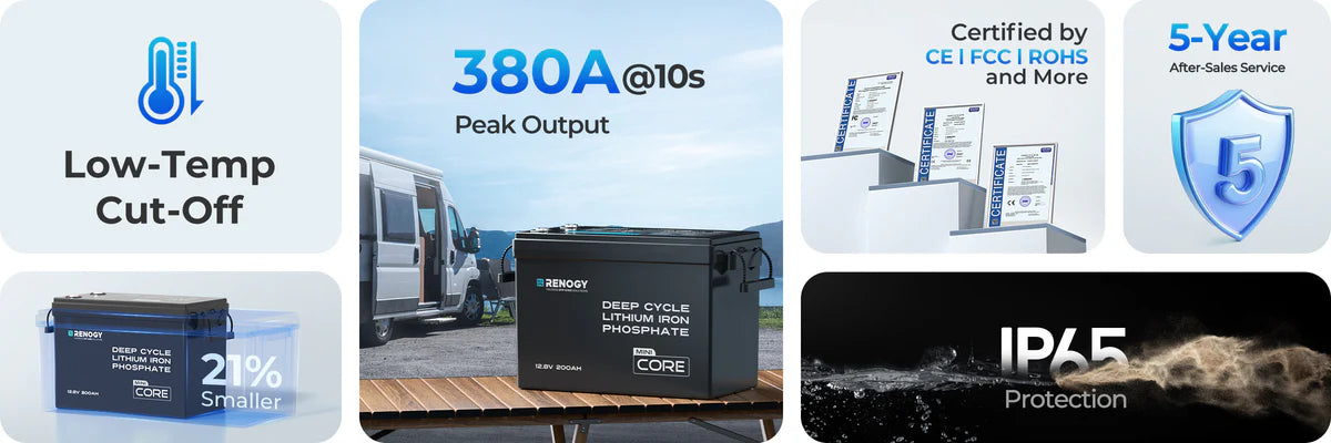 Compatta ma potente, questa batteria LiFePO₄ da 200Ah offre fino a 5,12 kWh di energia affidabile per l’uso off-grid. Il Core BMS con controllo Bluetooth garantisce gestione intelligente e sicura, mentre la protezione Low-Temp Cut-Off evita la ricarica al gelo. Con oltre 4000 cicli, certificazioni complete e struttura IP65, è una soluzione duratura per caravan, camper e sistemi solari.