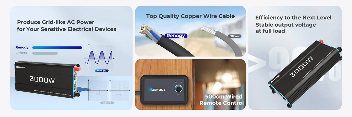 Potenza stabile e pulita per tutta la tua attrezzatura. L’onda sinusoidale pura assicura un’alimentazione sicura per dispositivi sensibili come laptop, CPAP e apparecchi elettronici di precisione, mentre la potenza di 3000W gestisce senza sforzo carichi pesanti e picchi di avviamento. Con il passaggio automatico tipo UPS e il controllo remoto cablato, hai energia affidabile e continua nel tuo caravan o sistema off-grid.
