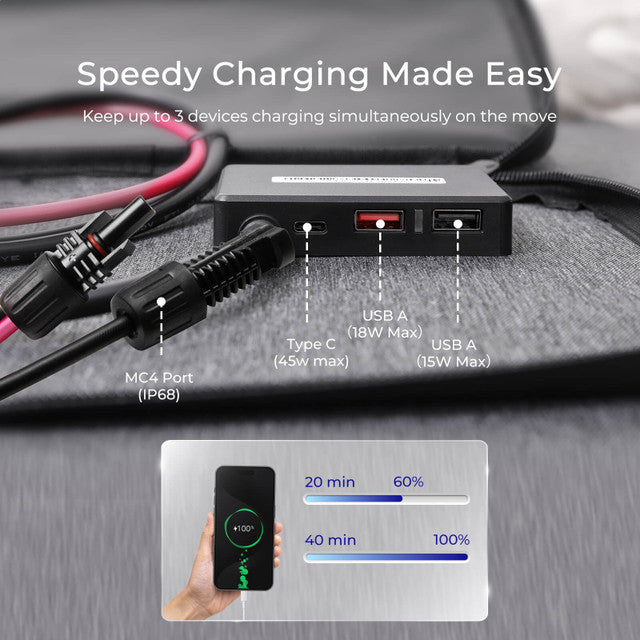 The Eflex solar panel can charge most batteries (charge controller needed) and power stations. It is important to ensure that the open circuit voltage of the panel will not exceed the max DC input voltage rating of the powerstation or charge controller.